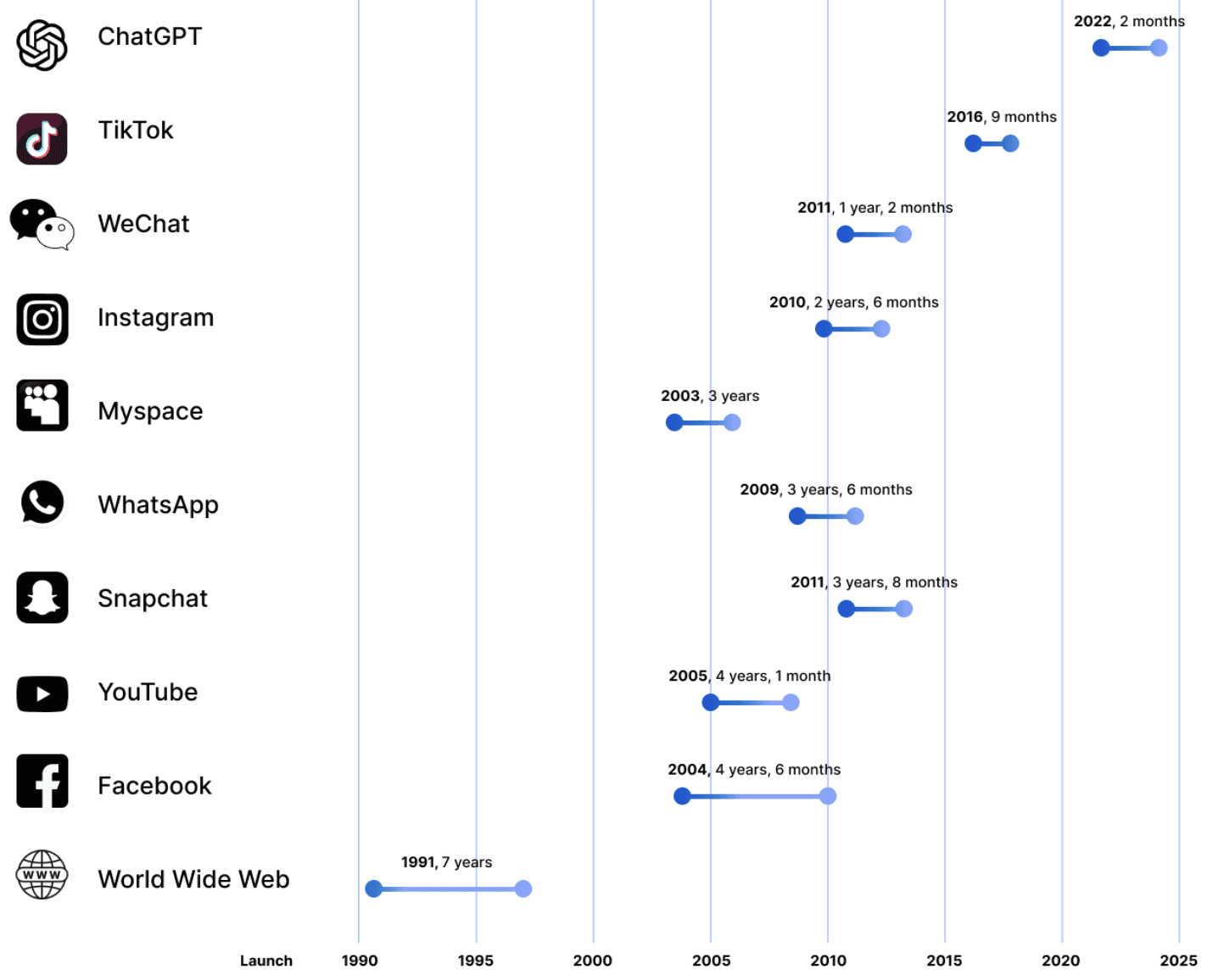 The statistics for how quickly AI has been adopted are mind-blowing. For example, consider how long it took the internet and leading social media companies to reach 1 million users. The World Wide Web took 7 years, Instagram 2.5 years, TikTok 9 months - it took ChatGPT a mere 2 months.