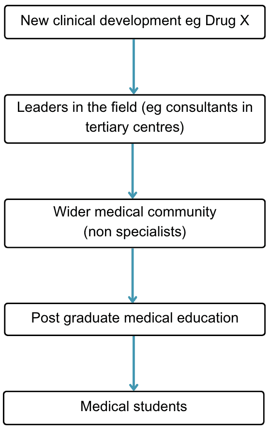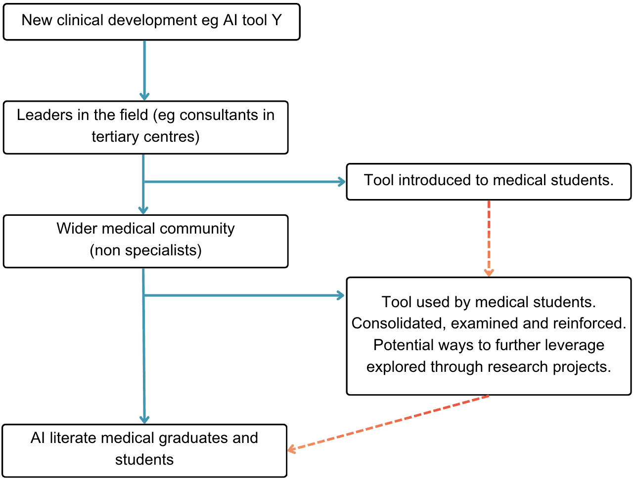 Traditionally, medical education has operated on a backwards working model, whereby students learn established practices and methodologies. The trickling down of new information can be slow. There might be the odd slide on “novel drug x” in lectures, but this is never formally tested therefore, the information is not reinforced. If this were to remain the case we would have a lag of AI literate clinicians.