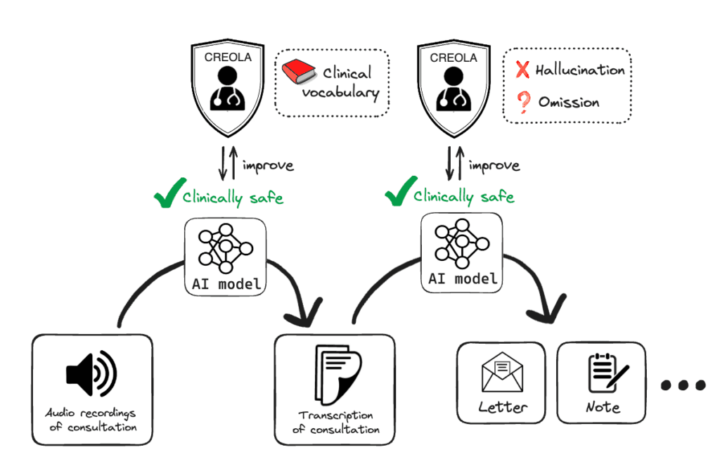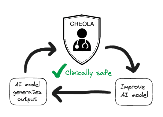 Figure 3: The CREOLA clinician-in-the-loop framework: each model’s output is evaluated by clinicians and the feedback is used to elevate safety to the highest standards paving the way for seamless incorporation into the clinical setting.