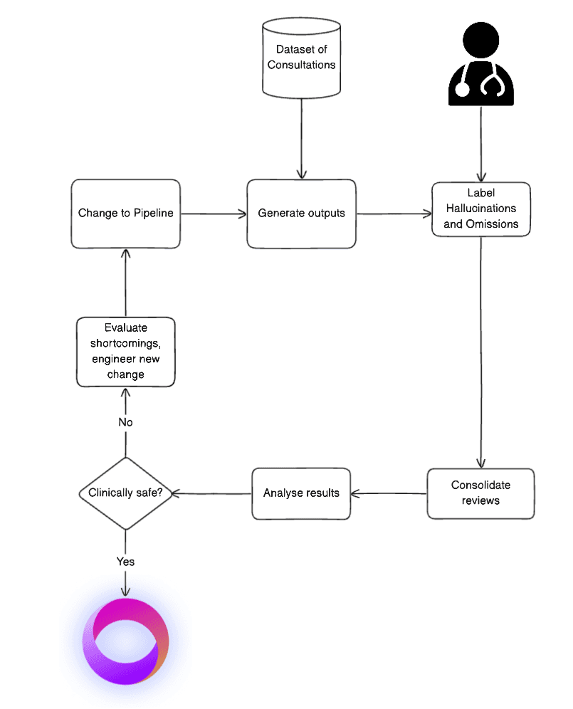 In the summarisation section, clinicians see the transcription of the consultation and the output that was generated from our models, i.e. a medical note or letter. An interactive user interface enables clinicians to smoothly and effectively identify two critical error types in the model’s output: instances of fabricated information (hallucinations) and cases where essential details are missed (omissions). Inspired by protocols in medical device certifications, we categorise errors as either ‘major’ or ‘minor’, where major indicates an impact on the diagnosis or the management of the patient. This classification system enables us to quantify changes in our models and prioritise issues in order to ensure safe integration of AI-generated summaries into clinics.